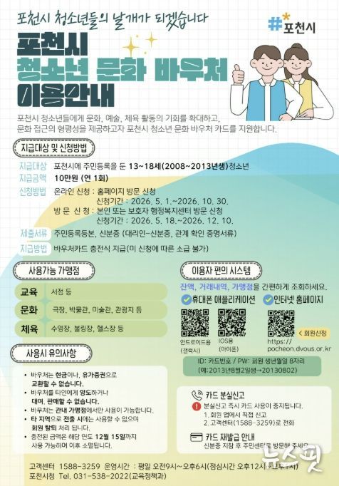 (뉴스핏 = 김호 기자) 포천시는 청소년의 문화 접근성을 높이고 다양한 체험 기회를 제공하기 위해 ‘포천시 청소년 문화 바우처 지원사업’을 본격 시행한다.
