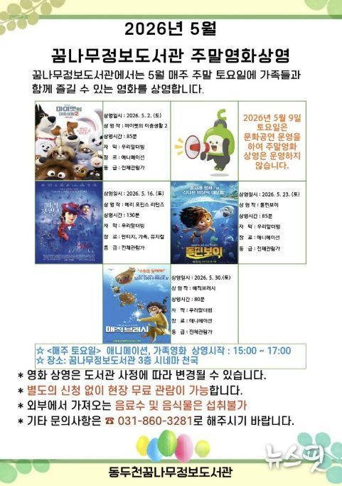 (뉴스핏 = 김호 기자) 동두천시 도서문화사업소 정보도서관에서는 오는 5월 매주 토요일 어린이와 가족을 위한 애니매이션 및 가족영화 4편을 상영한다고 밝혔다.
