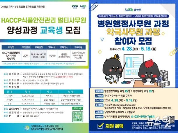 (뉴스핏 = 김수진 기자) 남양주시는 ‘2026년 지역·산업맞춤형 일자리 창출 사업’의 일환으로 취업연계형 직업훈련 3개 과정 참여자를 모집한다고 29일 밝혔다.