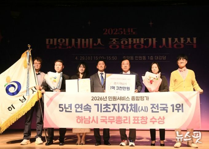 (뉴스핏 = 김호 기자) 하남시가 전국 기초자치단체 중 최고 수준의 민원서비스 역량을 인정받으며 5년 연속 최우수 기관으로 선정됐다. 하남시는 29일 정부세종청사에서 열린 ‘2025년 민원서비스 종합평가’ 우수기관 시상식에서 국무총리 표창을 수상했다고 밝혔다.