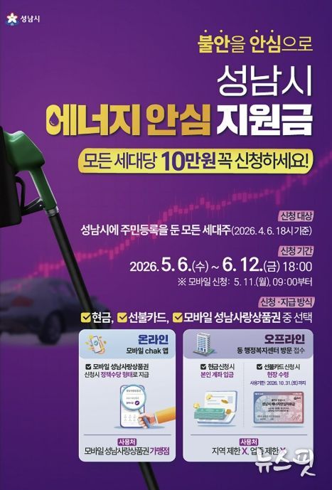 (뉴스핏 = 김수진 기자) 성남시는 중동 사태에 따른 국가 자원안보 위기 경보 발령으로 경제적 부담이 커진 시민들을 지원하기 위해 전국 최초로 ‘성남시 에너지 안심지원금’을 오는 5월 6일부터 신청을 받는다고 30일 밝혔다.