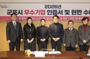 (뉴스핏 = 김수진 기자) 군포시는 17일 시청 3층 중회의실에서 ‘2025년 군포시 우수기업 인증서 및 현판 수여식’을 열고 5개 우수기업에 인증서와 현판을 수여했다. ‘우수기업 선정사업’은 2022년부터 시작하여 올해 4번째로 추진하는 사업으로 일자리 창출, 세수 증대 등 지역경제 활성화에 기여한 기업을 선정하여 인센티브를 부여하는 사업이다. 선정된 우수기업은 인증기간(3년) 동안 군포시 중소기업 육성자금 지원 시 추가 이차보전, 군포시 관내 공영주차장 이용 시 주차요금 감면, 협약병원 의료비 지원 등의 인센티브가 부여된다. 하은호 군포시장은 “어려운 경제 상황 속 관내 우수한 기업에 활력을 불어넣기 위한 우수기업 선정사업에 관심 가져주심에 감사드리며, 앞으로도 기업지원 사업을 다각화하여 기업 경영하기 좋은 환경을 만들겠다”고 말했다. 올해 선정된 군포시 우수기업은 △(주)아이씨에이치 △㈜지비티코리아 △주식회사예선테크 △듀라텍 주식회사 △㈜트리플닷 으로 총 5개 기업이다.