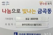 (뉴스핏 = 김호 기자) 지난 29일 수원시 권선구 금곡동 행정복지센터는 한주오토시스템즈(주)로부터 저소득 가정을 지원하기 위한 성금 300만 원을 전달받았다고 밝혔다. 이번에 전달된 성금 300만 원은 금곡동 관내 저소득 가정을 대상으로 한 특화사업 및 맞춤형 복지사업에 활용될 계획이다. 한주오토시스템즈(주) 조성문 대표는 “연말을 맞아 지역 내 어려운 이웃들에게 작은 보탬이 되길 바란다”며 “앞으로도 지역사회와 함께 성장하며 나눔을 실천하는 기업이 되도록 노력하겠다”라고 말했다. 장성임 금곡동장은 “연말을 맞아 어려운 이웃을 위해 따뜻한 나눔을 실천해 주신 한주오토시스템즈(주)에 깊이 감사드린다”며 “앞으로도 지역사회와 상생하는 기업으로 지속적인 역할을 해주시길 기대한다”라고 말했다.