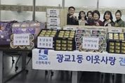(뉴스핏 = 김호 기자) 영통구 광교1동은 지난 2월 11일, 설 명절을 앞두고 관내 단체와 기관의 따뜻한 나눔이 이어지는 가운데 ‘설 명절 이웃나눔 전달식’을 개최했다고 밝혔다. 광교1동에 따르면, 이번 전달식에는 동남용역이 후원한 햄 40세트와 시립광교동어린이집에서 정성껏 준비한 생필품 꾸러미 40박스가 전달됐다. 또한 광교1동 지역사회보장협의체에서 마련한 후원금과 광교1동 공동모금회를 통해 준비된 떡국떡, 전, 나물, 과일 등 명절 음식도 함께 전달돼 뜻깊은 의미를 더했다. 특히 이번 나눔은 기업과 보육기관, 지역 복지단체가 한마음으로 참여해 설 명절을 앞두고 소외되기 쉬운 이웃들에게 따뜻한 정을 전하며 지역사회에 훈훈한 분위기를 조성했다. 광교1동은 이날 전달된 성금과 물품을 저소득 가정과 취약계층, 홀몸 어르신 등 도움이 필요한 이웃들에게 전달해 따뜻하고 풍성한 설 명절을 보낼 수 있도록 지원할 예정이다. 송숙영 광교1동장은 “설 명절을 맞아 어려운 이웃을 위해 소중한 정성을 모아주신 모든 분들께 깊은 감사의 말씀을 드린다”며, “전달받은 성금과 물품은 꼭 필요한 이웃들에게 정성껏 전달해