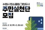 (뉴스핏 = 김호 기자) 수원특례시가 ‘생활 속 탄소중립 실천’을 확산하기 위해 2월 12일부터 20일까지 탄소중립 그린도시 사업 대상지 주민·생활권자를 대상으로 ‘수원시 탄소중립 그린도시 주민실천단’ 신규 참여자를 모집한다. 주민실천단은 탄소중립 그린도시 사업 대상지 주민과 생활권자로 구성된 시민 참여 조직이다. 지역 내 탄소중립 실천 활동과 홍보, 주민 참여 활동 등을 한다. 특히 수원시는 올해 주민실천단을 70명 규모로 확대 운영할 계획이다. 지난해 운영 성과를 바탕으로 신규 참여자를 모집해 참여 기반을 넓히고, 일회성 캠페인을 넘어 생활 속 실천이 자연스럽게 이어지는 탄소중립 문화를 확산할 계획이다. 모집 대상은 고색동·오목천동·탑동·서둔동·호매실동·평동·평리동 일부 등 탄소중립 그린도시 사업 대상지 거주민과 해당 지역 생활권자다. 주민실천단은 자원봉사 형태로 활동하며 ▲생활 속 탄소 저감 실천 ▲지역 맞춤형 실천 활동 ▲탄소중립 실천 홍보 ▲분과 활동, 회의 ▲역량 강화 교육 등에 참여한다. 수원시는 탄소중립 그린도시 주민실천단 확대 운영에 맞춰 참여자 역량을 높이는 교육과 분