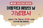 (뉴스핏 = 김수진 기자) 오산시는 오는 19일 ‘아동학대예방의 날’과 ‘아동학대예방주간’을 맞아 기념행사 및 온·오프라인 캠페인을 실시한다고 12일 밝혔다. 행사는 19일 오전 10시부터 12시까지 오산시청 대회의실에서 진행되며, ▲1부 아동학대예방의 날 기념식 식전공연, 유공자 표창 시상, 퍼포먼스, ▲2부 부모교육 특별강연으로 구성된다. 특별강연은 리플러스 인간연구소 박재연 소장이 ‘부모를 위한 건강한 대화방법’을 주제로 진행한다. 매년 11월 19일은 아동학대 예방과 방지에 대한 사회적 관심을 높이기 위해 제정된 법정기념일로, 오산시는 매년 기념식과 강연, 캠페인 등을 통해 아동학대 예방의 중요성을 알리는 다양한 활동을 추진해오고 있다. 시는 이달 25일까지 온라인 릴레이 캠페인도 함께 진행한다. 오산시민 누구나 SNS에 아동학대예방 메시지 또는 관련 사진을 업로드해 참여할 수 있다. 또한 11월 24일에는 시청 인근 주요 교차로에서 시민 대상 오프라인 홍보 캠페인을 실시해 아동학대 예방 인식 제고에 나설 예정이다. 박현주 아동복지과장은 “이번 행사가 아동학대 예방의 중요성을 되새기고 아이들
