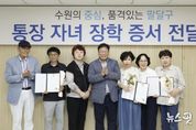 (뉴스핏 = 김호 기자) 수원시 팔달구는 지난 9월 19일 구청 상황실에서 ‘2025년 하반기 통장자녀 장학증서 전달식’을 통해 관내 통장들의 자녀에게 장학금을 전달했다. 통장은 마을의 크고 작은 일을 주민과 함께 해결하며 행정과 지역사회를 잇는 중요한 다리 역할을 하고 있다. 팔달구는 이러한 노고에 보답하고 통장들의 사기를 북돋우기 위해 매년 상·하반기 자녀 장학금을 지원해 오고 있으며, 이번 학기에는 각 동에서 1년 이상 근무한 통장을 대상으로 4명의 대학생에게 100만원의 장학금이 지급됐다. 유계심 팔달구 통장협의회 부회장은 “통장으로서 주민과 함께하는 일이 쉽지만은 않지만, 이렇게 팔달구가 우리의 수고를 기억해주는 것만으로도 큰 힘이 된다”며 “이번 장학금이 통장들에게 자부심이 되고, 또 자녀들에게는 든든한 응원이 되기를 바란다”고 소감을 전했다. 이상균 팔달구청장은 “통장님들의 헌신이야말로 우리 구정의 든든한 뿌리”라며, “오늘 장학금이 우리 학생들의 꿈을 키우는 밑거름이 되기를 바란다”고 전했다.