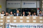 (뉴스핏 = 김호 기자) 수원시 장안구 정자3동은 지난 19일, 추석 명절을 앞두고 관내 어려운 이웃들을 위한 이웃돕기 나눔 전달식을 가졌다. 이날 전달식에서 기부된 식료품 꾸러미는 주민자치회 33박스, 통장협의회 17박스, 단체장협의회 10박스로, 전달받은 물품은 관내 기초생활수급자 등 생활이 어려운 가구에 전달될 예정이다. 이판수 주민자치회장은 “추석을 맞아 우리 이웃이 풍요로운 한가위를 보내는 데 도움이 될 수 있도록 앞으로도 각 단체 회원들이 앞장서겠다.”고 말했다. 송근숙 정자3동장은 “어려운 이웃을 위해 나눔의 손길을 내밀어주셔서 깊은 감사의 말씀을 전한다”며, “지원해주신 물품은 도움이 필요한 분들에게 잘 전달될 수 있도록 세심히 살피겠다”고 전했다.